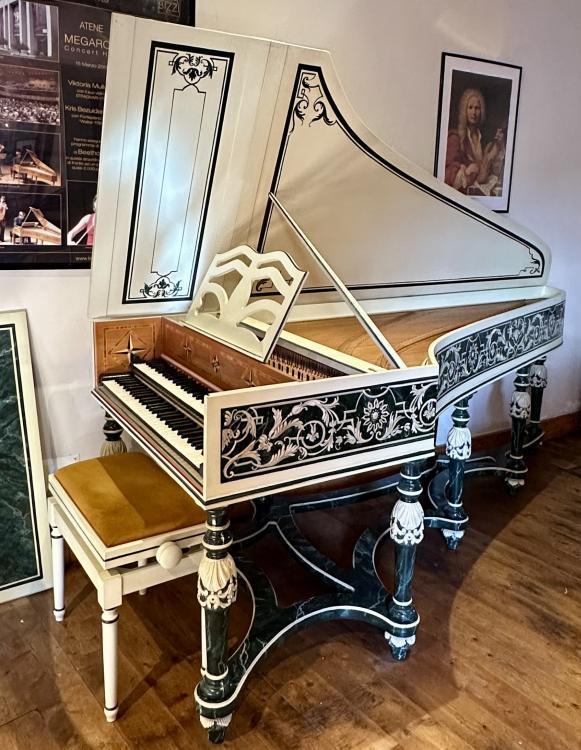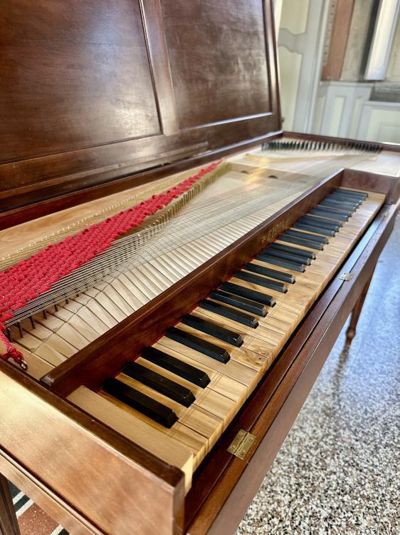 The instrument stands out for its refined decorative character, with an elegant painted case, richly detailed side panels and a set of finely hand-carved legs, faithfully copied from the original models and connected by a shaped underframe.